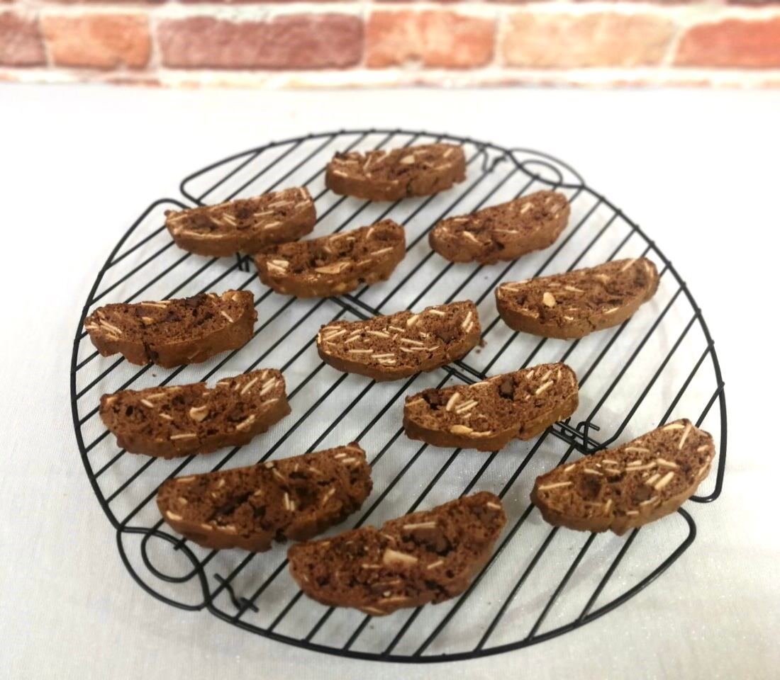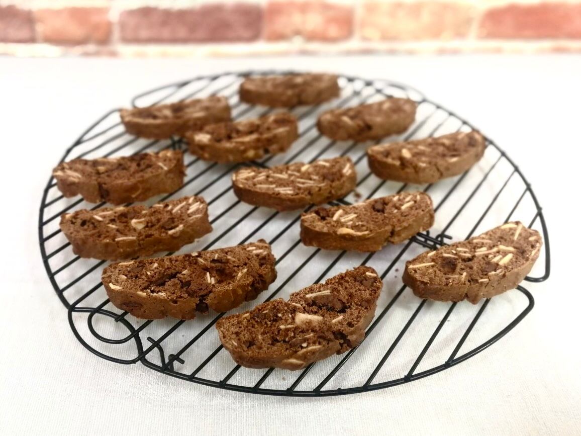 ココアパウダーを加えたチョコ風味のビスコッティに刻んだミルクチョコレートとアーモンドスライスを混ぜ込み焼き上げました。